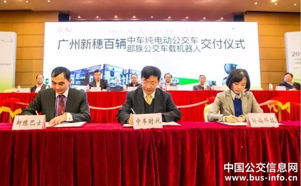 交付儀式現場,中車時代電動、廣州新穗巴士、廣州部落科技簽訂了三方戰略合作協議,旨在共同推進廣州市智能綠色公共交通的發展。