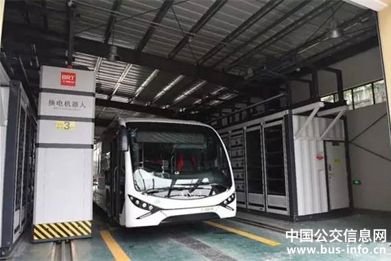 位于鳳山街的換電站采用換電機器人,僅用9分鐘就可完成BRT十組電池的換裝。