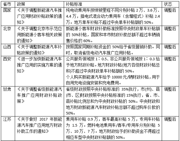 補貼新政里的這些要求,迫使地方政府不得不重新調整已出臺的新能源汽車補貼政策。據第一電動網不完全統計,截至目前,北京、山西、西安、甘肅、江蘇、天津六省市明確了2017年補貼標準。