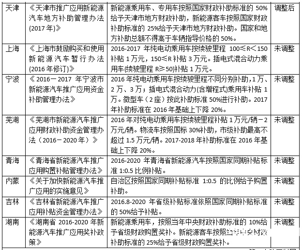 寧波2016年純電動乘用車最高補助3萬元,蕪湖2016年純電動乘用車最高補助2萬元,兩城市2017年補助標準在2016年基礎上下降20%。青海、內蒙、吉林按國標50%補貼。湖南新能源乘用車按國標10%補貼。