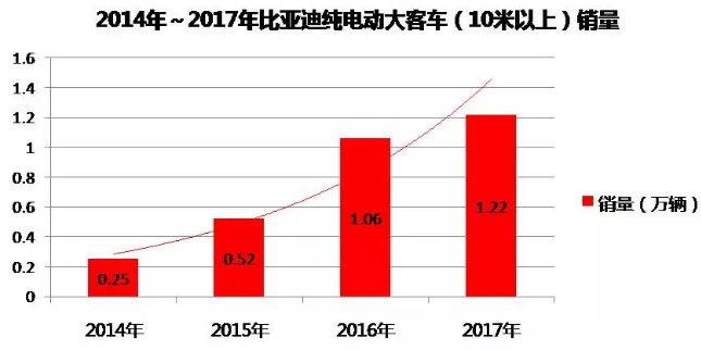 2017年,在全國新能源客車整體銷量同比大幅下滑背景下,比亞迪客車實現逆勢增長,全年銷量14336輛(全部為純電動,含控股公司廣汽比亞迪1559輛),同比增長8%。其中,8米以上銷量達14254輛,同比增長13.6%,占總銷量99%;10米以上銷量達12228輛,同比增長14.5%,占總銷量85%,位居全國新能源大客車銷量第一!