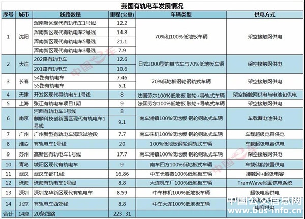有軌電車在國外得到廣泛應用,但在國內的應用尚屬于起步階段。截至 2017年12月31日,我國14個城市共有20條有軌電車線路投入運營,其中沈陽、大連、長春等地是全國最早運營有軌電車的城市。我國有軌電車發展情況如表: