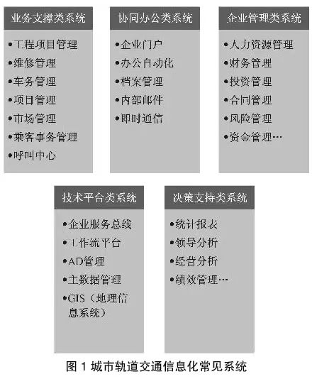 城市軌道交通運(yùn)營信息化系統(tǒng)一般可分為生產(chǎn)信息化系統(tǒng)和管理信息化系統(tǒng)。生產(chǎn)信息化系統(tǒng)主要是指地鐵各相關(guān)專業(yè)與運(yùn)營生產(chǎn)維護(hù)密不可分的信息化系統(tǒng),如信號(hào)、通信、綜合監(jiān)控、PSCADA、AFC、ACC等系統(tǒng)。管理信息化系統(tǒng)是指在運(yùn)營生產(chǎn)管理中常用的計(jì)算機(jī)輔助手段,如辦公自動(dòng)化、人力資源管理、財(cái)務(wù)管理、資產(chǎn)管理等系統(tǒng)。