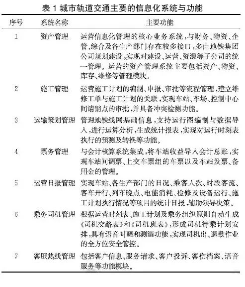 國內(nèi)各地鐵公司運(yùn)營信息化管理系統(tǒng)主要包括OA、內(nèi)外部門戶、財(cái)務(wù)管理、資產(chǎn)管理、施工管理、運(yùn)輸策劃管理、票務(wù)管理、運(yùn)營日?qǐng)?bào)管理、乘務(wù)司機(jī)管理、服務(wù)熱線等系統(tǒng),其主要功能如表1所示。