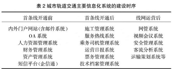國內(nèi)各家地鐵公司信息化系統(tǒng)的建設(shè)時(shí)序并不完全統(tǒng)一,這一方面與當(dāng)時(shí)所處的社會(huì)整體環(huán)境,即軟件系統(tǒng)的發(fā)展程度相關(guān);另一方面也受限于各地鐵公司自身的發(fā)展定位和經(jīng)營策略。但通過對(duì)近幾年新近開通的地鐵公司信息化建設(shè)時(shí)序和運(yùn)營經(jīng)驗(yàn)較豐富的地鐵公司信息化系統(tǒng)重新規(guī)劃及建設(shè)的順序分析,在不同階段,運(yùn)營管理信息化系統(tǒng)的建設(shè)時(shí)序大致如表2所示。