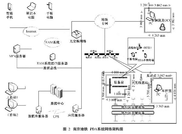 通過移動(dòng)終端技術(shù),實(shí)現(xiàn)現(xiàn)場(chǎng)維護(hù)的數(shù)據(jù)采集、技術(shù)支持和信息反饋,真正意義上實(shí)現(xiàn)現(xiàn)場(chǎng)運(yùn)行維護(hù)工作的全面管控,達(dá)到提高工作、管理效率和質(zhì)量的目標(biāo),實(shí)現(xiàn)了管理落地。其網(wǎng)絡(luò)架構(gòu)圖如圖2所示。廣州和蘇州地鐵也開發(fā)了類似的系統(tǒng),處于適用改進(jìn)階段。