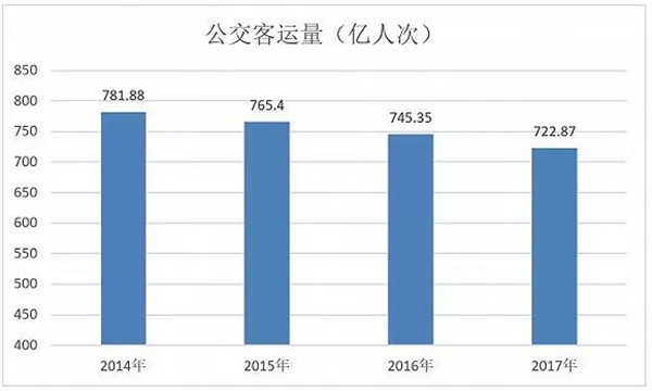 數(shù)據(jù)也佐證了郭艷彬的感受,全國(guó)公交的整體客流量在2014年之前是逐年上升的,從2014年開(kāi)始客流量開(kāi)始下滑。
