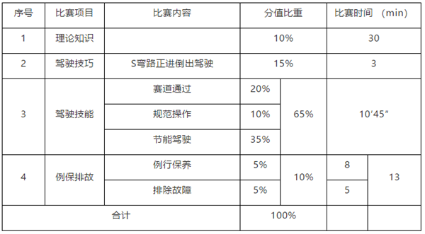 (二)駕駛技能考核:采用百分制,考核時(shí)間為10分45秒,考試成績(jī)×65%納計(jì)總成績(jī)。駕駛技能考核部分共有三小項(xiàng)內(nèi)容:1、賽道通過考核,考試成績(jī)×20%納計(jì)總成績(jī);2、規(guī)范操作考核,考試成績(jī)×10%納計(jì)總成績(jī);3、節(jié)能技術(shù)考核,考試成績(jī)×35%納計(jì)總成績(jī)。