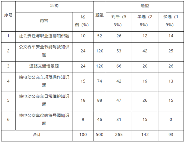 2、試題依據(jù):標(biāo)準(zhǔn)化題庫(kù)以《中華人民共和國(guó)道路交通安全法》、《國(guó)家標(biāo)準(zhǔn)GB7258機(jī)動(dòng)車運(yùn)行安全技術(shù)條件》、交通運(yùn)輸部行業(yè)標(biāo)準(zhǔn)《城市公共汽車駕駛員操作規(guī)范》等法律法規(guī)和相應(yīng)規(guī)章為依據(jù),結(jié)合新能源和清潔能源的相關(guān)知識(shí)。