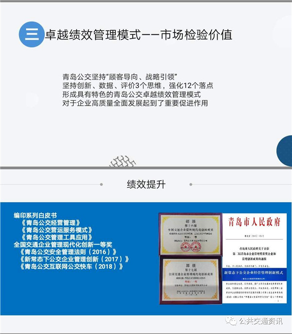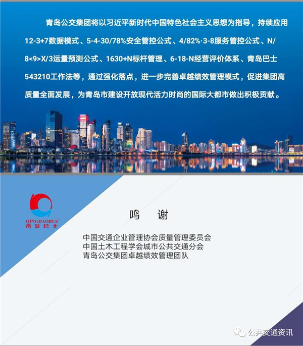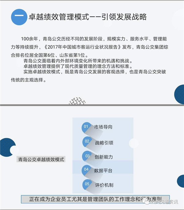 青島公交管理團(tuán)隊(duì)在實(shí)施卓越績效管理的過程中,形成了“市場(chǎng)導(dǎo)向+戰(zhàn)略引領(lǐng)+創(chuàng)新能力+數(shù)據(jù)平臺(tái)+評(píng)價(jià)機(jī)制”為主要素的青島公交卓越績效模式,正在成為企業(yè)員工尤其是管理團(tuán)隊(duì)的工作理念和行為準(zhǔn)則。