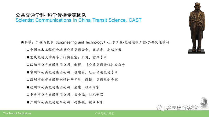 公共交通學(xué)科首席科學(xué)傳播專家團(tuán)隊(Expert Team for Public Transport),是在中國土木工程學(xué)會城市公共交通分會領(lǐng)導(dǎo)下,由全國公共交通行業(yè)具有較高學(xué)術(shù)造詣,熱愛科普、支持科普、奉獻(xiàn)科普的公共交通相關(guān)領(lǐng)域的科技工作者組成,專家團(tuán)隊首批成員包括: