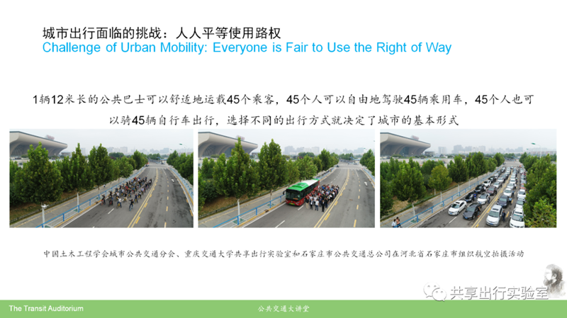 2018年在石家莊與公交集團(tuán)一起組織的和“人人平等使用路權(quán)”航拍活動,展現(xiàn)城市道路上45人選擇公共巴士、自行車和私人汽車出行的三種場景,這組照片直觀地讓人們判斷什么方式是可持續(xù)城市出行。