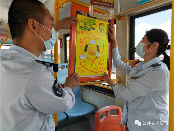 5月19日,青島公交集團李滄巴士志愿者將“理解與尊重同行,關(guān)愛公交駕駛員”的手繪圖張貼在了207路線多部車廂中。走進車廂,彩色的宣傳海報、手抄報映入眼簾,充滿了溫馨的節(jié)日氣氛,車廂中張貼的“理解與尊重留言墻”引人注目。手繪的“留言墻”分為“感謝理解與支持”、“共同理解,共筑家園”兩部分,以握手、大樹一幕幕真實而細膩、有寓意的場景,勾勒了公交駕駛員與乘客之間互動、交流、相處的瞬間。