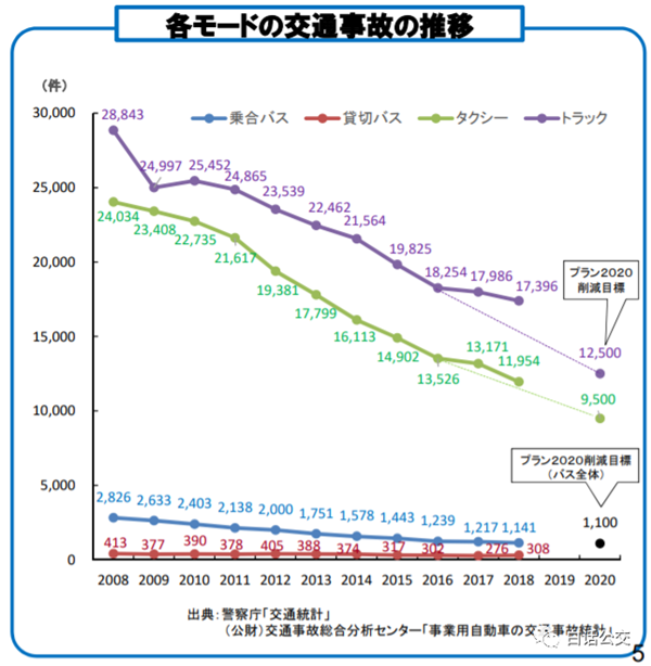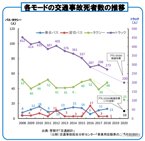 道路交通運(yùn)輸事故近10年來(lái)呈明顯下降趨勢(shì)(事故總量上公交遠(yuǎn)低于出租車和卡車),2018年全日本共發(fā)生公共汽電車事故1141起,是近十年的最低。從死亡人數(shù)來(lái)看,2018年,常規(guī)公交因事故造成的死亡人數(shù)是13人。日本的公交安全水平非常高。
