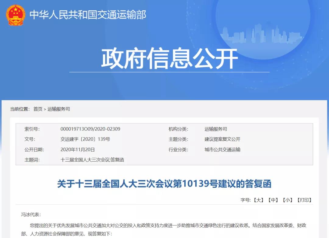 2020年11月20日,交通運輸部運輸服務司發布了《關于十三屆全國人大三次會議第10139號建議的答復函》。