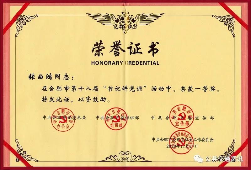合肥公交集團第三巴士公司司直黨支部書記張曲鴻榮獲合肥市第十八屆“書記講黨課”競賽活動一等獎。