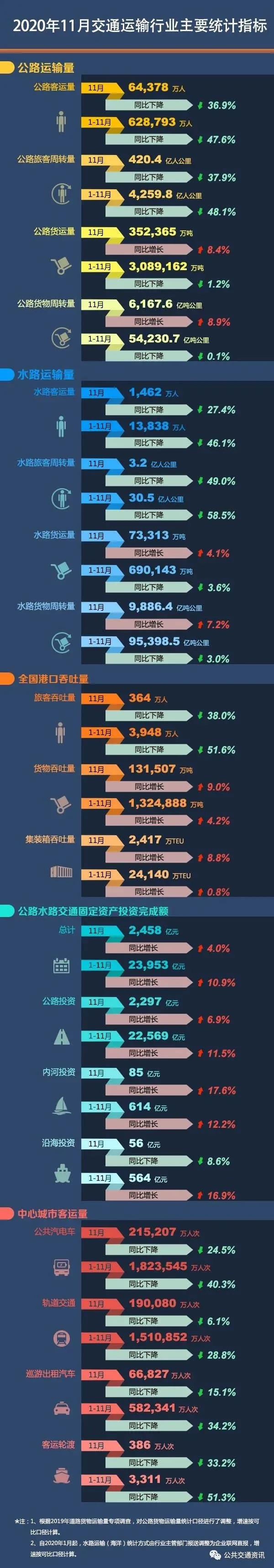 公共汽電車:11月客運量215,207萬人次,同比下降24.5%;1~11月客運量1,823,545萬人次,同比下降40.3%。
