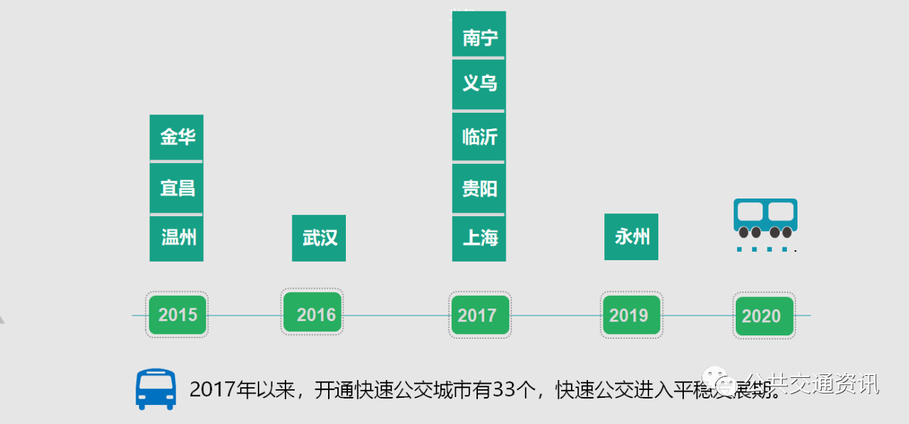 1.目前,全國開通快速公交33個城市,其中2017年以來開通快速公交城市有6個,分別是南寧、義烏、臨沂、貴陽、上海、永州。從中可以看出,快速公交的建設進入平穩發展期。