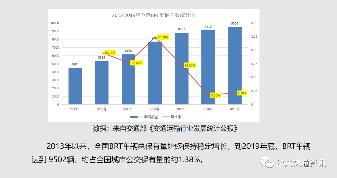 2019年底,BRT車輛達到9502輛,約占全國城市公交保有量的1.38%。