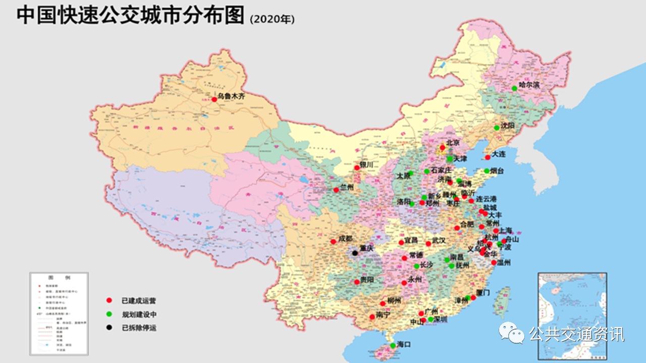 3.下面大家看到的這幅圖,是我們中國快速公交城市分布圖(2020版),圖中可以直觀看一下全國快速公交的建設、規劃情況,其中我們發現浙江、江蘇和山東是快速公交建設開通最多的三個省份。