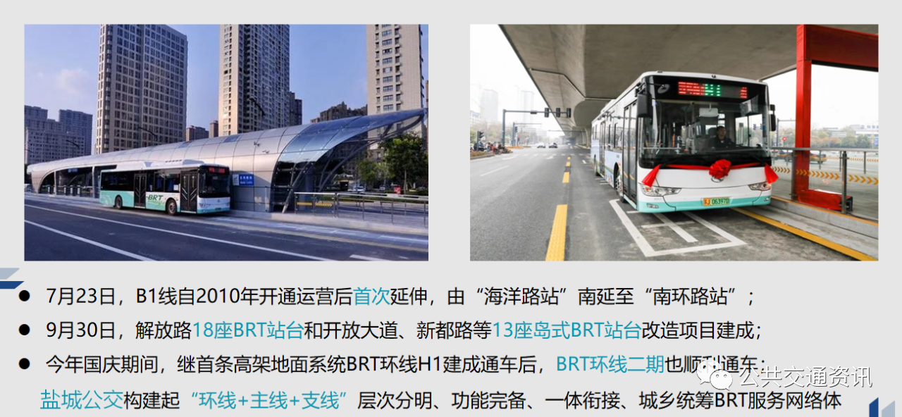 7月23日,B1線自2010年開通運營后首次延伸;9月30日,解放路18座BRT站臺改造新項目和開放大道、新都路等13座島式BRT站臺維修改造項目建成;今年國慶期間,BRT環線二期也順利通車,鹽城公交構建起了“環線+主線+支線”的層次分明、功能完備、一體銜接、城鄉統籌BRT服務網絡體系。