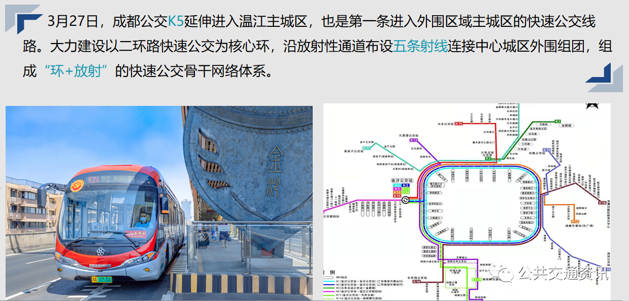 3月27日,K5延伸進入溫江主城區,也是第一條進入外圍區域主城區的快速公交線路。成都公交大力建設以二環路快速公交為核心環,沿放射性通道布設五條射線連接中心城區外圍組團,組成“環+放射”的快速公交骨干網絡體系。