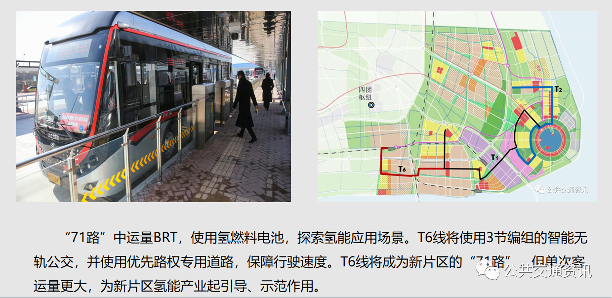“71路”中運量BRT,使用氫燃料電池,探索氫能應用場景。T6線將成為新片區的“71路”,但單次客運量更大,為新片區氫能產業起引導、示范作用。