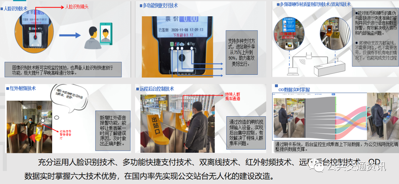 充分運用人臉識別技術、多功能快捷支付技術、雙離線技術、紅外射頻技術、遠程后臺控制技術、OD數據實時掌握六大技術優勢,在國內率先實現公交站臺無人化的建設改造。