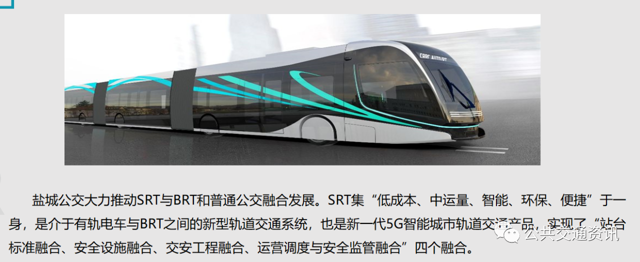 大力推動SRT與BRT和普通公交融合發展。SRT是介于有軌電車與BRT之間的新型軌道交通系統,也是新一代5G智能城市軌道交通產品,實現了“站臺標準、安全設施、交安工程、運營調度與安全監管”四個融合。