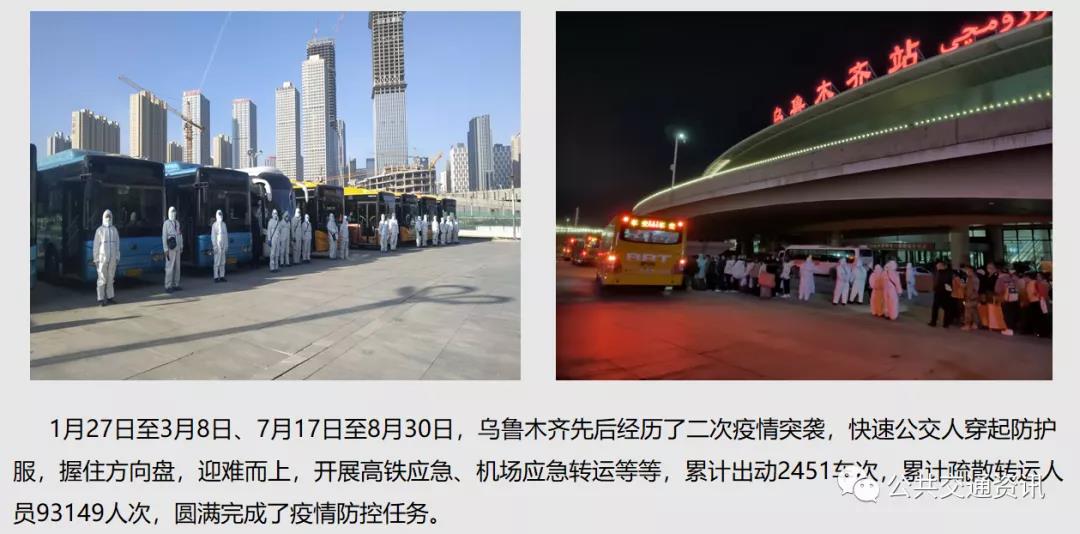 1月27日至3月8日、7月17日至8月30日,烏魯木齊先后經歷了二次疫情突襲,快速公交人穿起防護服,迎難而上,開展應急轉運,累計出動2451車次,疏散轉運人員93149人次,圓滿完成了疫情防控任務。
