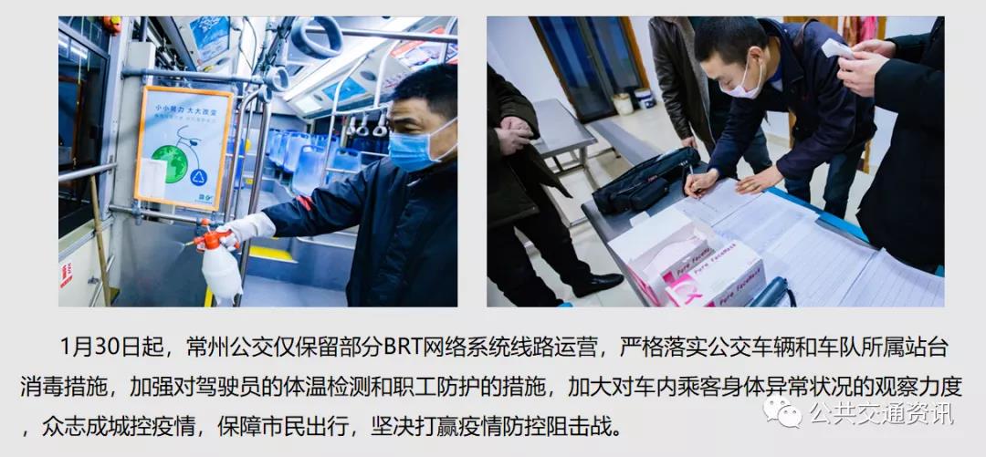 1月30日起,常州公交僅保留部分BRT網絡系統線路運營,嚴格落實公交車輛和車隊所屬站臺消毒措施,加強對駕駛員的體溫檢測和職工防護的措施,加大對車內乘客身體異常狀況的觀察力度,眾志成城控疫情,保障市民出行,堅決打贏疫情防控阻擊戰。