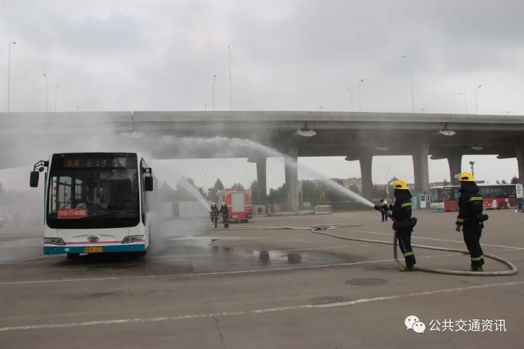 當日上午10時許,公交車防恐消防綜合應急演練在汽車北站場站上演。現場,一輛613路公交車行駛至站臺等待乘客上下車時,兩名攜帶汽油的“歹徒”趁著擁擠的人群擠上車,乘務管理員識破一名“歹徒”攜帶的礦泉水瓶內裝有汽油,上前試圖阻攔并與其對峙,“歹徒”掏出藏在包里的菜刀想要挾持駕駛員,駕駛員見狀迅速打開車門疏散乘客,迅速報警。這時另一名潛伏的“恐怖分子”在乘客慌亂之中趁機拿出打火機點燃汽油扔向車廂。此時,接到報警的公安部門趕到現場,將“恐怖分子”制服并帶上警車。駕駛員擺脫危險后趕緊拿起車廂滅火器對現場火情進行控制,就在這時,消防車也迅速趕至現場,消防官兵們將高壓水槍對準車廂,不到10分鐘結束險情。