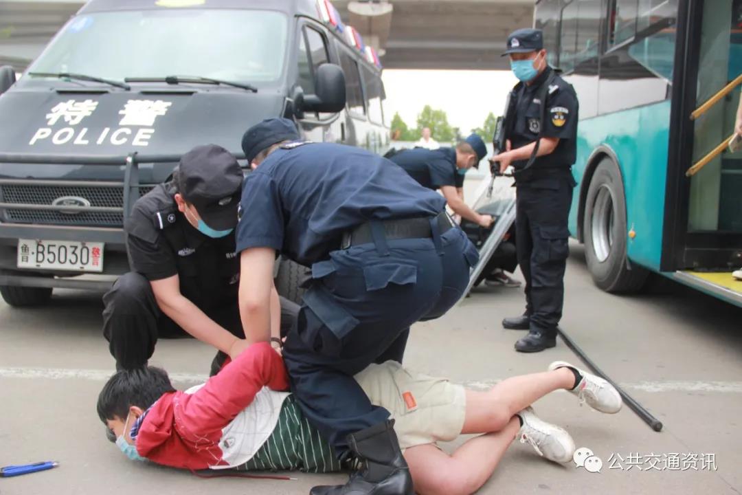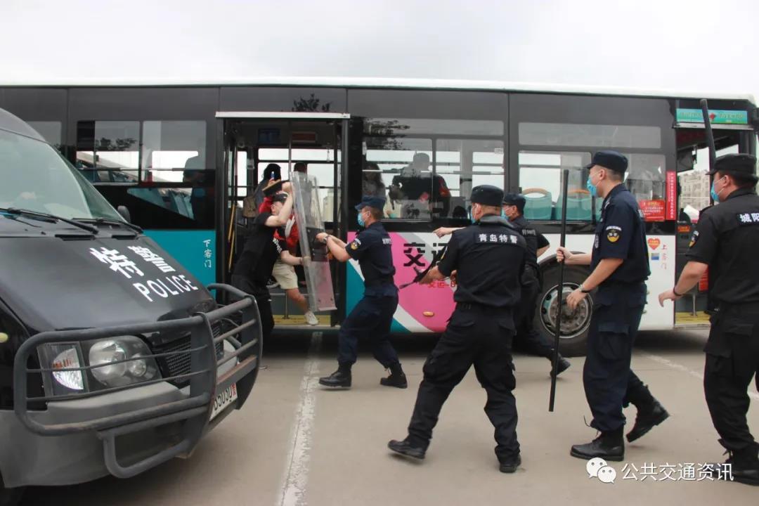 6月16日上午,在青島城運控股交運溫馨巴士通達分公司汽車北站場站內,幾名特警將一輛公交車團團圍住,對車內縱火的“歹徒”展開強攻,并順利將其制服,隨后消防車迅速處置火情……原來這是由青島城運控股交運溫馨巴士通達分公司聯合青島市公安局城陽分局反恐大隊、特巡警大隊、流亭消防中隊、流亭派出所和多邦保安公司聯合舉行的防恐消防綜合應急演練。