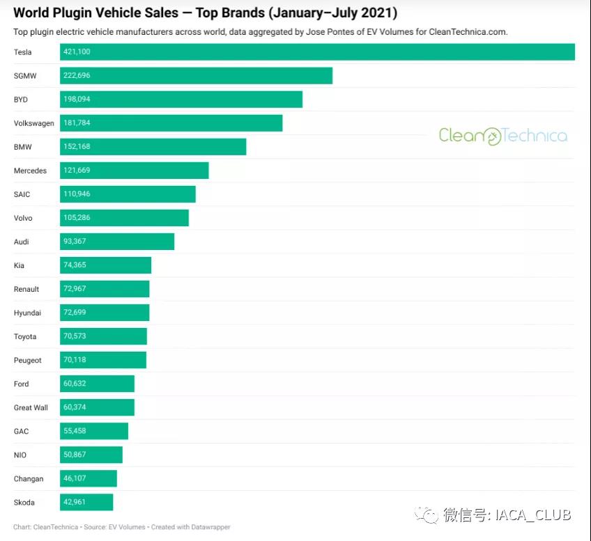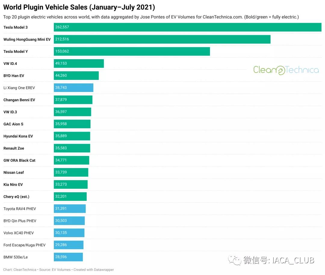 再來看看前7月全球電動車銷量榜單,進步最大的還是中國品牌電動車。從榜單來看,銷量最高的依舊來自特斯拉旗下的Model 3車型,前7月全球累計銷量為262,557輛,Model Y則以153,062輛的成績排名第三,兩款車型占據全球電動汽車市場13.6%的份額。
