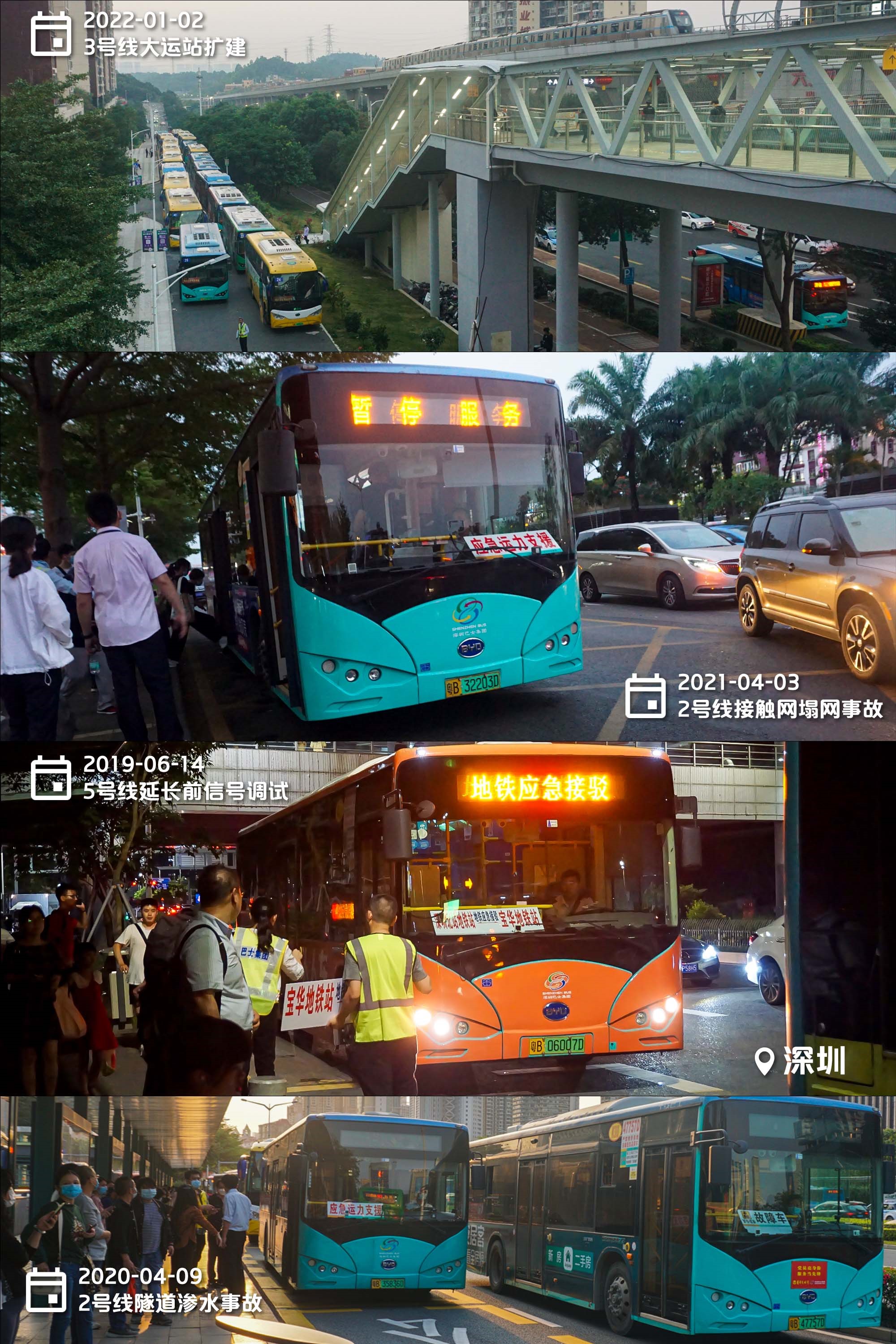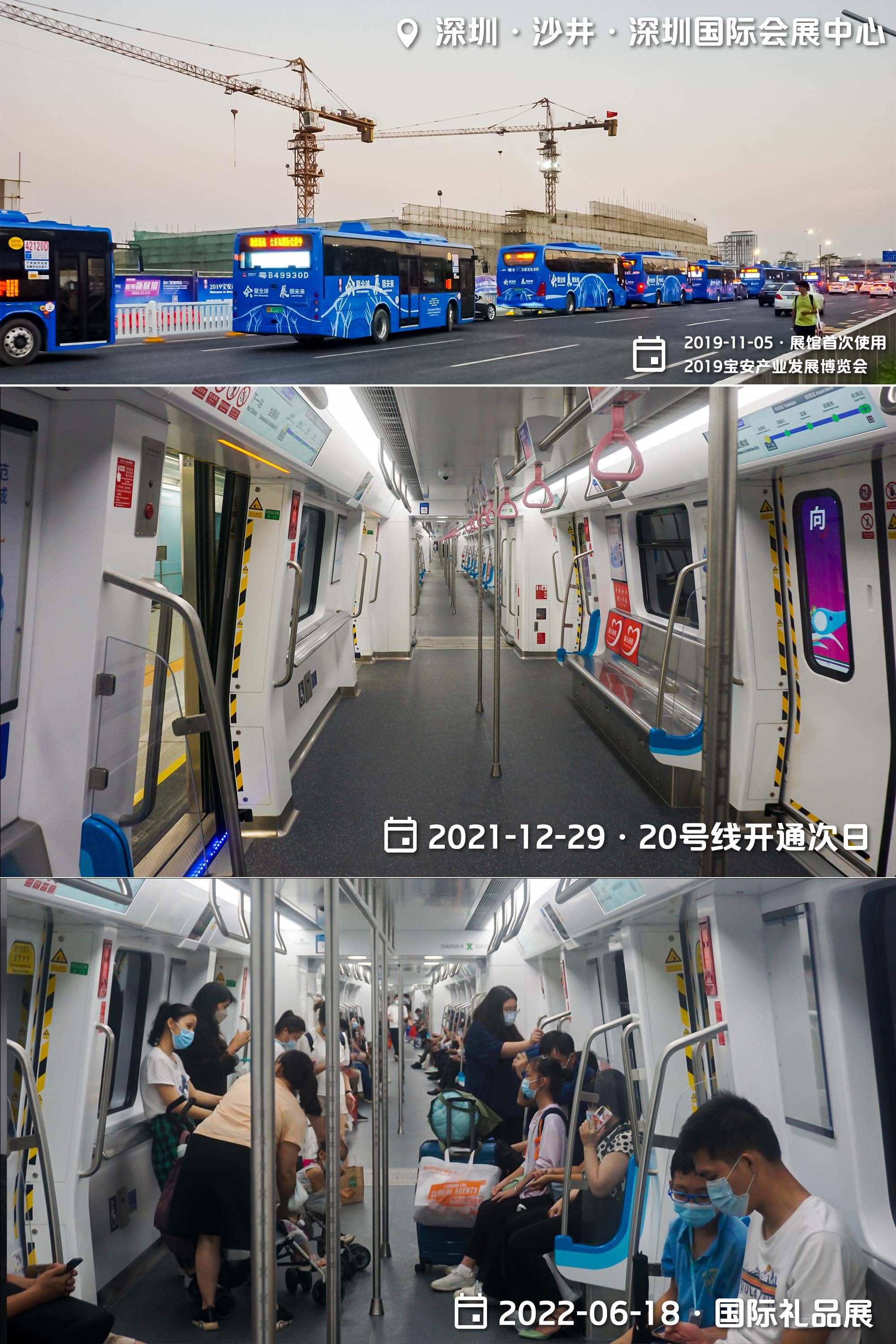 深圳國際會展中心是個匆忙上馬趕工的項目,原使用專線接駁巴士連接地鐵11號線,但第一次展會就因一個亂配時的紅綠燈崩潰(上);未獲批先開工的地鐵20號線兩年后補票拿到準生證,取代了巴士,但即使有展會的日子,20號線客流也相當慘淡,現在還多了12號線分薄。