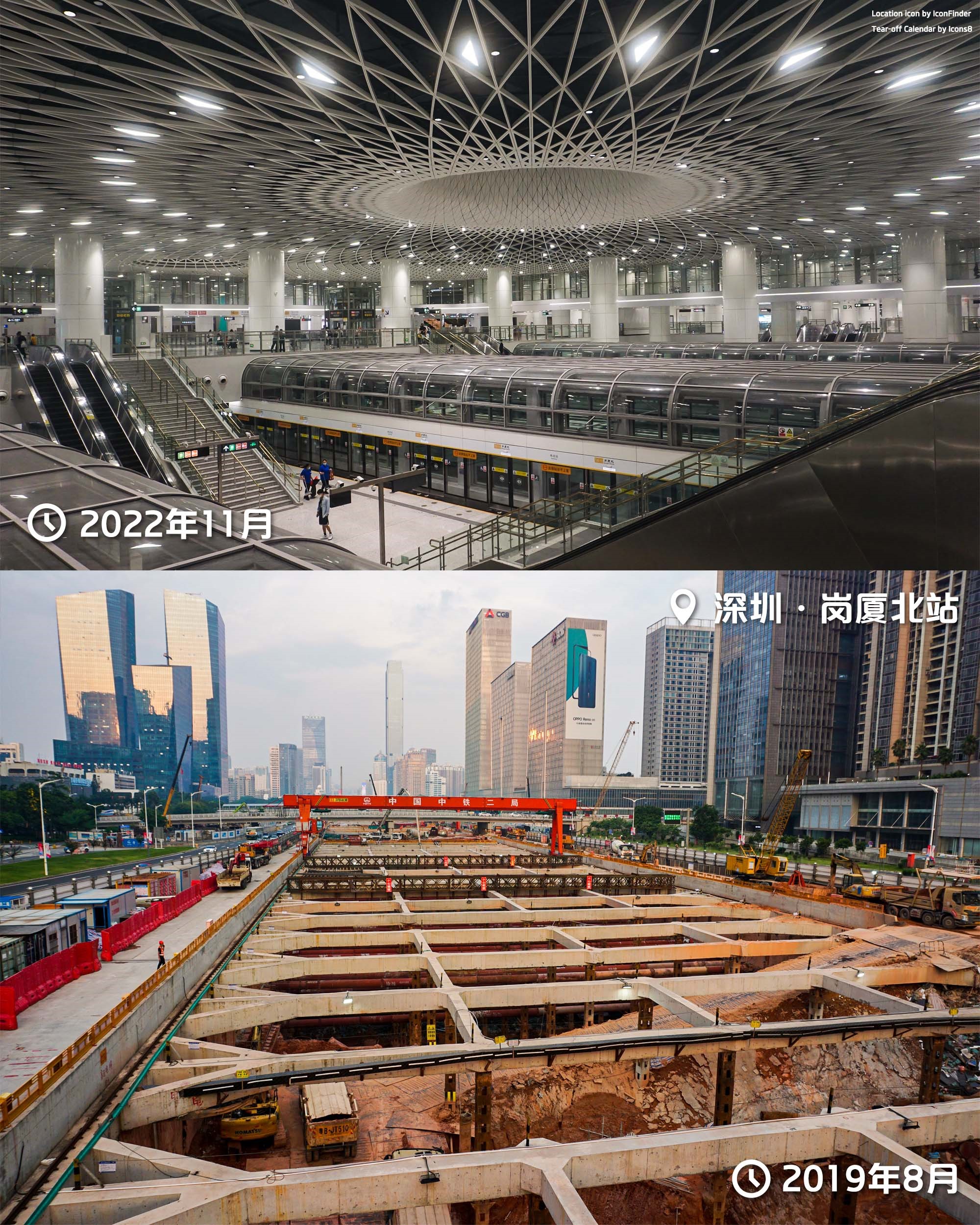 深圳地鐵崗廈北站:巨大的開挖規模造就了網紅景點“深圳之眼”,但此外樞紐各處細節,尤其地面道路,設計和施工質量一般。