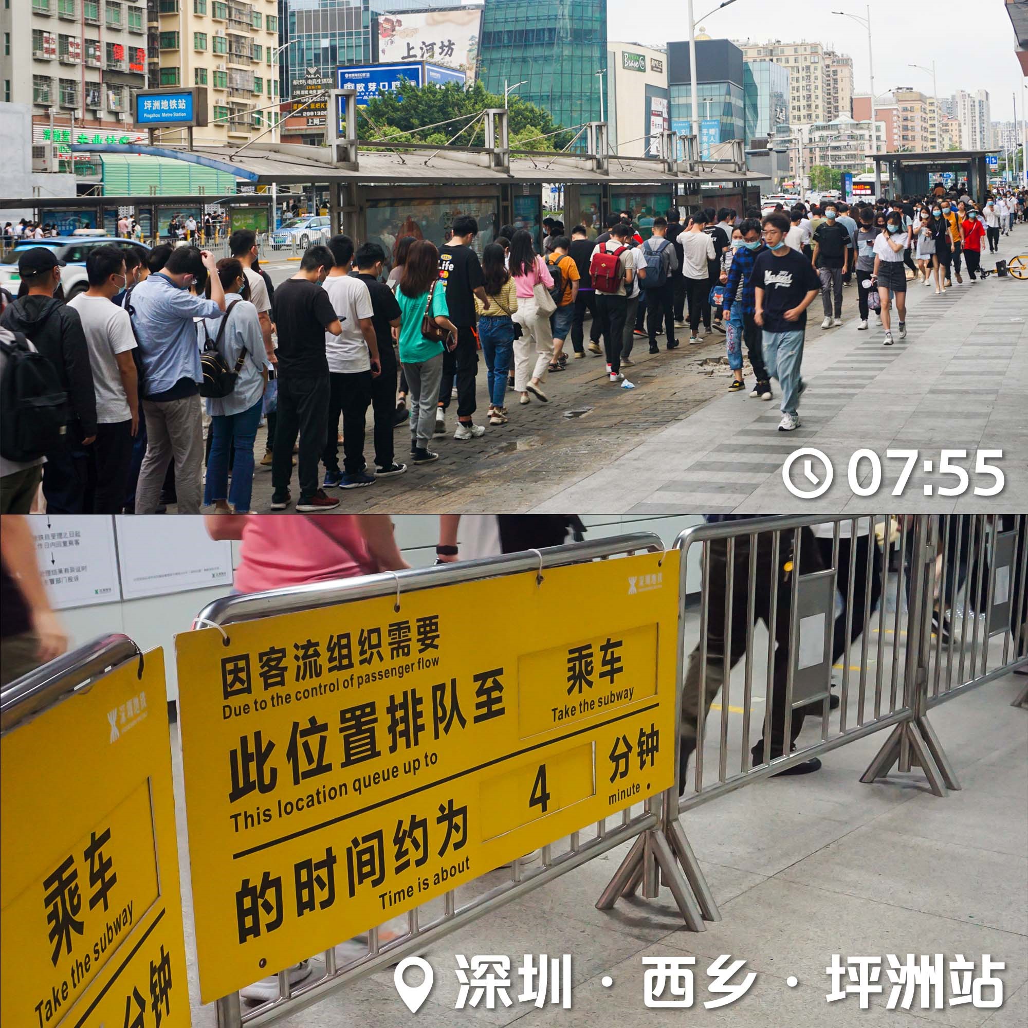 早高峰坪洲地鐵站外的長隊:有時候地鐵吃撐了,乘客也沒有別的選擇,因為巴士在擁堵的路面的行車時間難以預估;深圳地鐵1號線為這一段在全線投入極限運能,早高峰從坪洲到白石洲是沙丁魚罐頭,再往東開到福田和羅湖市中心反而有座(攝于2021年4月)