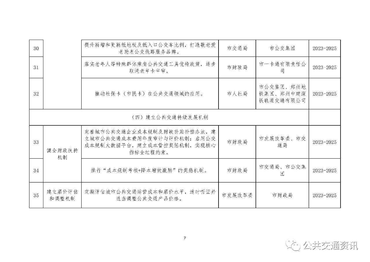 1.健全財政扶持機制。加大政府對城市公共交通場站建設和改造、新能源車輛推廣、充換電設施建設、信息化水平提升、適老化改造等方面的資金支持力度。完善政府購買城市公共交通服務制度。完善城市公共交通企業成本規制及財政補貼補償辦法,建立城市公共交通成本費用年度審計與評價機制;啟用公交成本規制大數據平臺,建立成本管控獎懲機制,實現核心指標全過程約束。推行“成本規制考核+降本增效激勵”的獎懲機制,有效激發全員增收積極性。全面落實城市公共交通企業依法享受的減征或免征有關稅費政策。(市財政局、市交通局、市發展改革委、國家稅務總局鄭州市稅務局、市公交集團、鄭州地鐵集團、鄭州中建深鐵軌道交通有限公司按照職責分工落實)2.建立票價評估和調整機制。按照“政府可負擔、企業可持續、百姓可承受”的原則,理順城市公共交通票價機制,逐步完善城市公共交通票制票價體系,定期評估城市公共交通運營成本和票價水平,適時聽證并適當調整公共交通產品價格。綜合性分析公交企業運營成本、效益水平、社會消費水平等因素,兼顧合理比價,建立票價與成本適當匹配的票價體系,完善城市公共交通票價與企業運營成本、政府補貼的聯動機制,保證政府、乘客與企業的合理分擔,讓公交票價的價格調整和經濟發展一致,促進城市公共交通持續健康發展。(市發展改革委、市交通局、市市場監管局、市財政局、市公交集團、鄭州地鐵集團、中建深鐵軌道交通有限公司按照職責分工落實)3.推進城市公交企業多元化發展。支持城市公共交通企業開展多元化經營業務,鼓勵發展定制公交、旅游公交,提高資源要素價值,釋放企業發展活力,增強企業“造血”能力。建立鄭州市定制公交運營管理制度,規范定制公交經營活動,維護市場秩序,保障運營安全,提高服務水平。鼓勵城市公共交通企業創新金融服務,拓寬融資渠道,保障持續的經營性流動資金。堅持市場化改革方向,鼓勵城市公共交通企業進行資源重組,形成行業發展合力,促進城市公共交通規模化、集約化、市場化發展,持續提升企業現代化治理能力。(市交通局、市公交集團、鄭州地鐵集團、鄭州中建深鐵軌道交通有限公司按照職責分工落實)