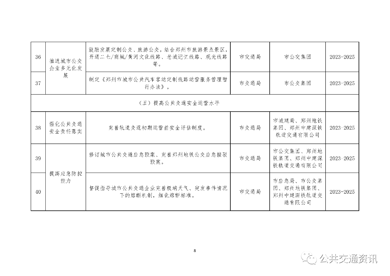 1.強化公共交通安全責任落實。充分利用科技和信息化手段強化公共交通安全生產管理,加強安全生產風險辨識、評估與管控工作,進一步壓緊壓實公共交通企業安全生產主體責任與行業主管部門運營安全監管責任。加強城市軌道交通建設、運營安全管理,完善軌道交通初期運營前安全評估制度。(市交通局、市城建局、市應急局、市公安交管局、市公交集團、鄭州地鐵集團、鄭州中建深鐵軌道交通有限公司按照職責分工落實)2.完善風險防范機制。加快完善城市公共交通企業安全生產雙重預防體系,嚴格開展城市公共交通運營安全風險隱患排查治理。加強城市公共交通重大風險防控,強化跨河橋梁、臨崖路段等交通安全設施檢查,完善駕駛區域安全防護隔離設施,強化車輛定期檢驗檢測和新能源車輛充換電管理。建立城市軌道交通安全保護區聯防聯控工作機制,加大對城市軌道交通異物侵限、保護區違規作業等行為的打擊力度。強化部門聯動機制建設,合力做好城市公共交通行業反恐、安檢、治安防范和消防安全管理相關工作,加強公共安全防范。(市交通局、市應急局、市公安交管局、市公交集團、鄭州地鐵集團、鄭州中建深鐵軌道交通有限公司按照職責分工落實)3.提高應急防控能力。修訂完善城市公共交通應急預案,與城市綜合應急預案銜接;完善鄭州地鐵公交應急接駁預案,整合運力資源,保障應急疏散工作高效開展。常態化組織開展各類應急演練,增強突發事件防范和應急處置能力。督促指導城市公共交通企業完善極端天氣、突發事件情況下的熔斷機制,細化熔斷標準。不具備安全運營條件時,堅決及時停運,嚴禁駕駛員冒險作業、涉險運營。強化大客流管控,加強重點車站客流監測和分析研判,明確大客流控制預警、風險管控措施及解除條件。優化特殊事件下的客流疏散組織,合理設計以公交/軌道為主導的疏散策略,常態化組織開展各類應急演練,加強跨部門聯動協調,不斷提升信息共享能力,增強突發事件防范和應急處置能力。(市交通局、市應急局、市公安交管局、市公交集團、鄭州地鐵集團、鄭州中建深鐵軌道交通有限公司按照職責分工落實)