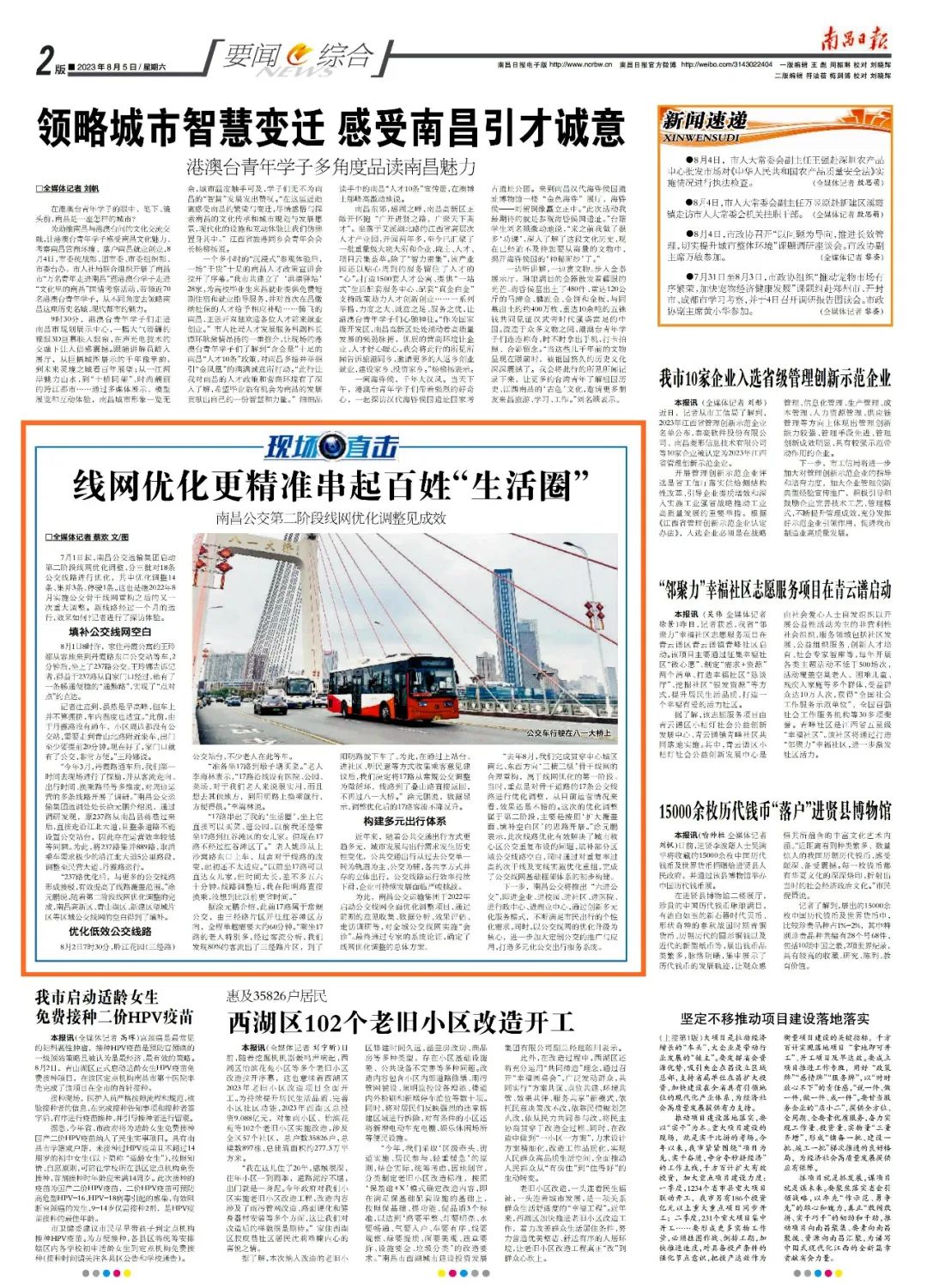導(dǎo)語(yǔ):2023年8月5日,南昌日?qǐng)?bào)第2版以《線網(wǎng)優(yōu)化更精準(zhǔn)串起百姓“生活圈”》為題,對(duì)南昌公交運(yùn)輸集團(tuán)第二階段線網(wǎng)優(yōu)化調(diào)整工作進(jìn)行了報(bào)道。