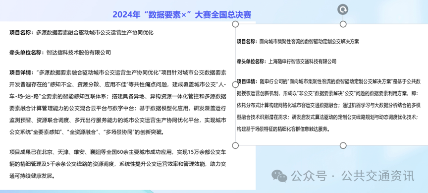 圖3 2024年“數據要素×”大賽全國總決賽獲獎作品城市公交行業的數字化轉型正加速邁向“體系重構、質效提升”的新階段。統一規劃、統一架構、統一服務、統一運維,實現資源的最優配置和效率的最大化,保障各子系統、子維度的可持續與協調統一。數字化轉型的核心目標是效率提升和模式創新。公交運營每天產生海量數據,通過對公交數據進行深入挖掘和分析,公交企業可以更準確地了解乘客的出行需求和公交線路的運營狀況,從而優化公交線路和班次,提升運營效率;利用數字化轉型帶來的紅利,通過數字系統的搭建,在平臺、數據、算法的加持下,可以精準把握出行需求,動態匹配供需,讓傳統的、固定的公交服務轉變為更具有彈性的、更準時的、人性化的服務形式,從而滿足不同乘客的出行需求,提升乘客滿意度和公交吸引力。目前全國已有60多個城市利用大數據、人工智能新技術,針對性提供定制公交、需求響應式公交等新型服務。重慶公交的數智化系統運用新型數字化架構,推進數據資源匯聚,實現“人、車、站、線、場”全要素的感知互聯,并整合內部運營數據及高德出行、氣象地災預警等外部數據;通過升級智能調度系統,實現遠程集中調度、多方式車輛監控、車輛到站時間預測、運營日報自動生成、多指標多角度分析等數字化應用,以供需平衡為導向,實現“客流、運力、路況”資源匹配的智能排班,主動優化調整線網及運營組織方案;構建互聯網