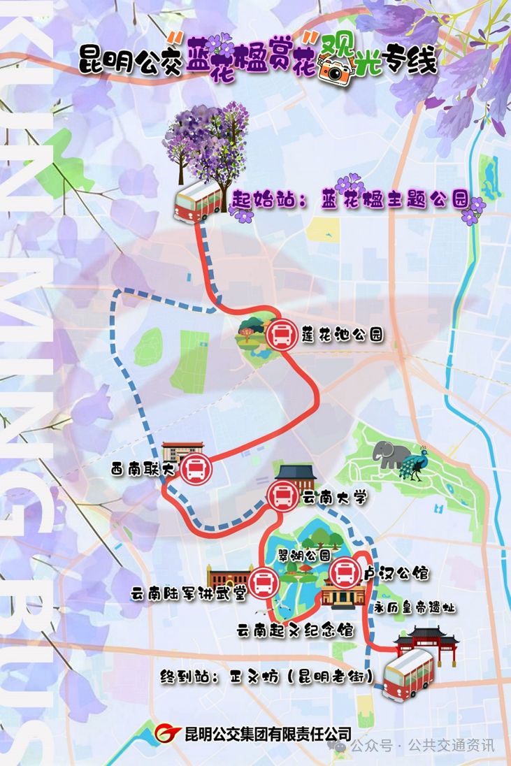 開行昆明公交“藍(lán)花楹賞花”觀光專線。隨著五華區(qū)教場中路的藍(lán)花楹陸續(xù)綻放,昆明市藍(lán)花楹即將進(jìn)入最佳賞花時(shí)期,昆明公交集團(tuán)為認(rèn)真落實(shí)市委、市政府關(guān)于“旅游興市”的戰(zhàn)略部署,結(jié)合全市藍(lán)花楹及有代表性的歷史人文景點(diǎn)分布實(shí)際,定于2025年4月28日起至全市藍(lán)花楹花期結(jié)束期間,開行一條昆明公交“藍(lán)花楹賞花”觀光專線。藍(lán)花楹賞花觀光專線將有效串聯(lián)起五華區(qū)教場中路賞楹核心區(qū)、蓮花池公園、云南師范大學(xué)(西南聯(lián)大舊址),以及云南大學(xué)、云南陸軍講武堂、云南起義紀(jì)念館、盧漢公館、永歷皇帝遺址等翠湖片區(qū)歷史人文景點(diǎn)和位于昆明市中心的正義坊昆明老街,成為市民、游客體驗(yàn)昆明市歷史人文和賞楹季藍(lán)花楹限定美景的最佳選擇。