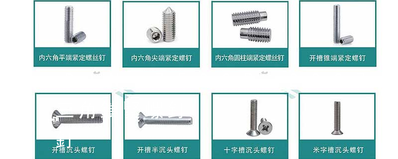 外扳擰:六角、六角法蘭面、六角凸緣、六角花形等;內扳擰:一字槽、十字槽H型(Phillips)、十字槽Z型(Pozidriv)、十字槽F型(Frearson)、四方槽(Scrulox)、復合槽、內花鍵、內六角花形(梅花槽)、內三角、內六角